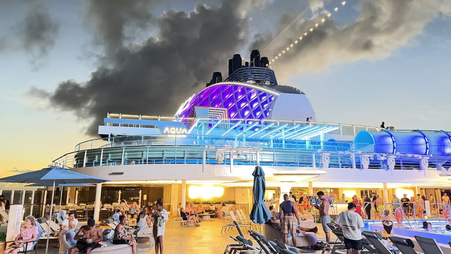 I walk out to the pool deck at sunset and you can see how Norwegian Aqua really lights up the sky.