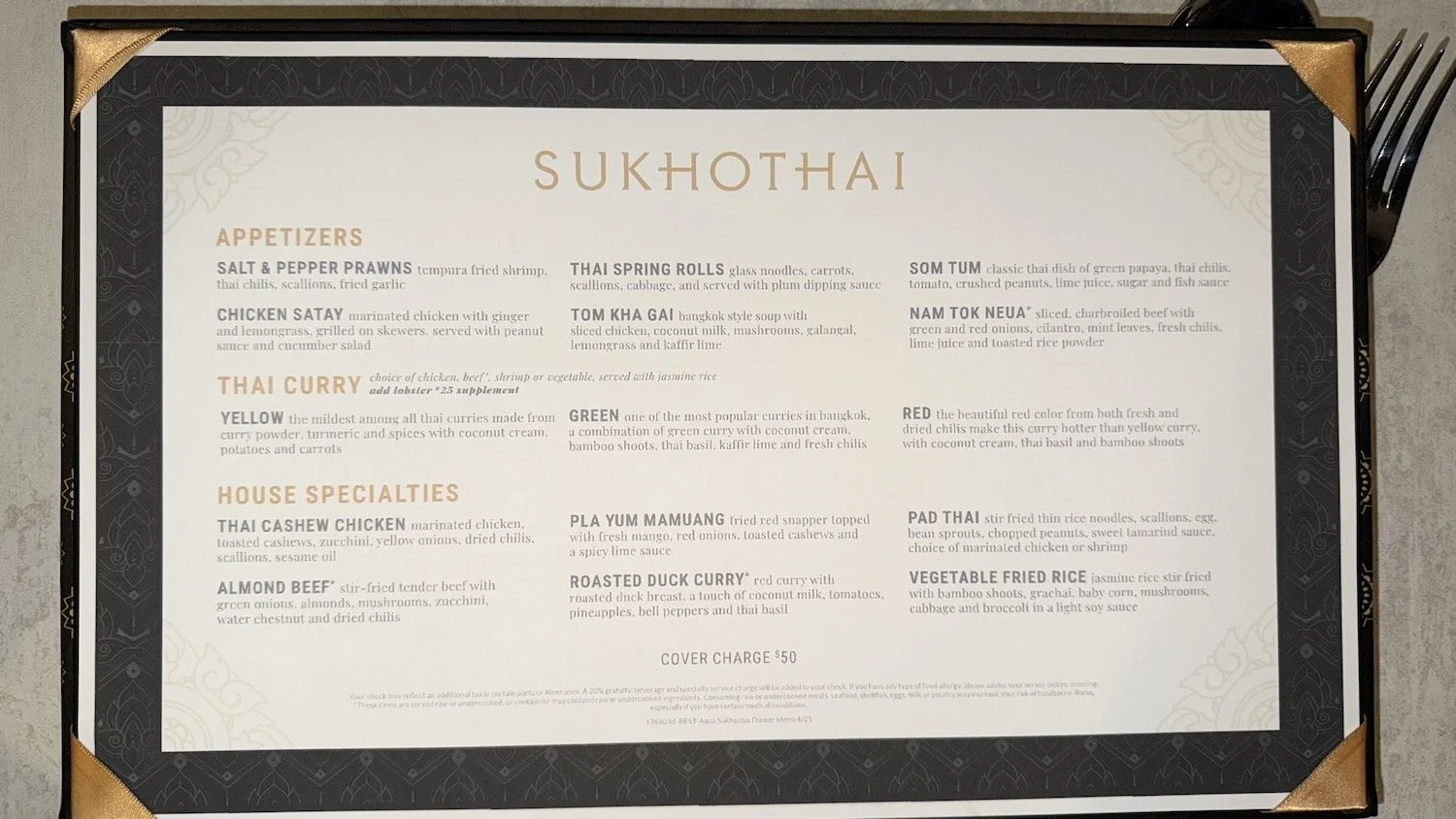 Our meal at Sukhothai was the best meal we have had onboard Aqua so far. Well done. And, well worth the $50/pp cover charge.
