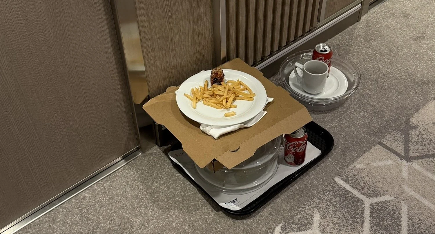 On my way to the elevators, I see dirty dishes stacked up in the hallway. Unfortunately, this is an all too common sight. We asked our room steward, Dominick, whether or not people who order room service should call room service back to pick up the dirty dishes. He said that, since the room stewards are usually the ones who deliver room service orders, the room steward should be called by the guest to pick up the dirty dishes. However, there may be a problem with that arrangement. NCL has gone to one service of the cabin per day (except in The Haven which still has two daily). If you order room service after your room steward has finished for the day, it is up to the crew working at Room Service to pick up the dirty dishes. Dominick tells us that pick up seldom happens, thus the dirty room service dishes stacked in the hallway.