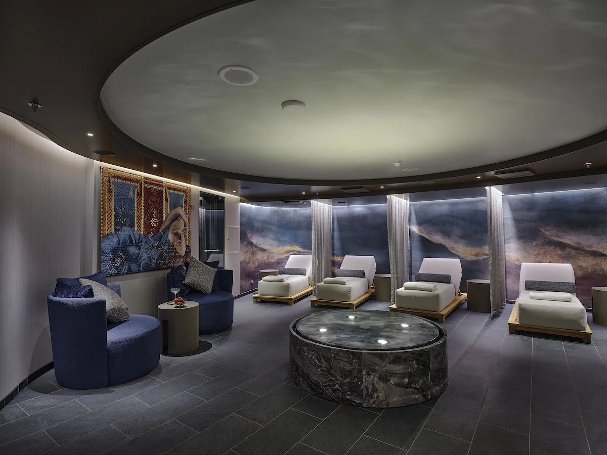 Designed by HBA London, Silver Dawn’s reimagined spa is more than 36m2 larger than that of her sister ship, Silver Muse, spanning over 790m2 on deck six. It includes an optimized layout for a more seamless wellness journey—enhanced with culinary delights, mood lighting and curated playlists—as well as an enhanced Beauty Salon, Fitness Center, Barber Salon, and an outdoor relaxation area of 219m2. A spacious relaxation room lies at its heart, which, elegantly decorated with Roman-inspired artworks and an infinity water feature, will invite guests to socialize as they are pampered in a soothing atmosphere. Inviting treatment rooms, a large sauna, and a steam room enhance the offering.