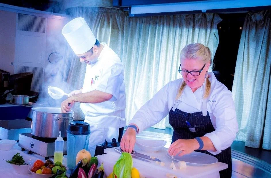 Above: Chef Jennifer Jasinski performs a culinary demonstration aboard Windstar Cruises. Jasinski won the James Beard Foundation Award for Best Southwest Chef in 2013 and sailed with Windstar as a James Beard Foundation guest chef in 2017.