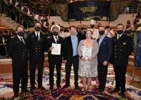 Caribbean Princess Senior Officers and Princess Cruises President John Padgett welcome the ship’s first guests,Alexander King and Jennifer Little