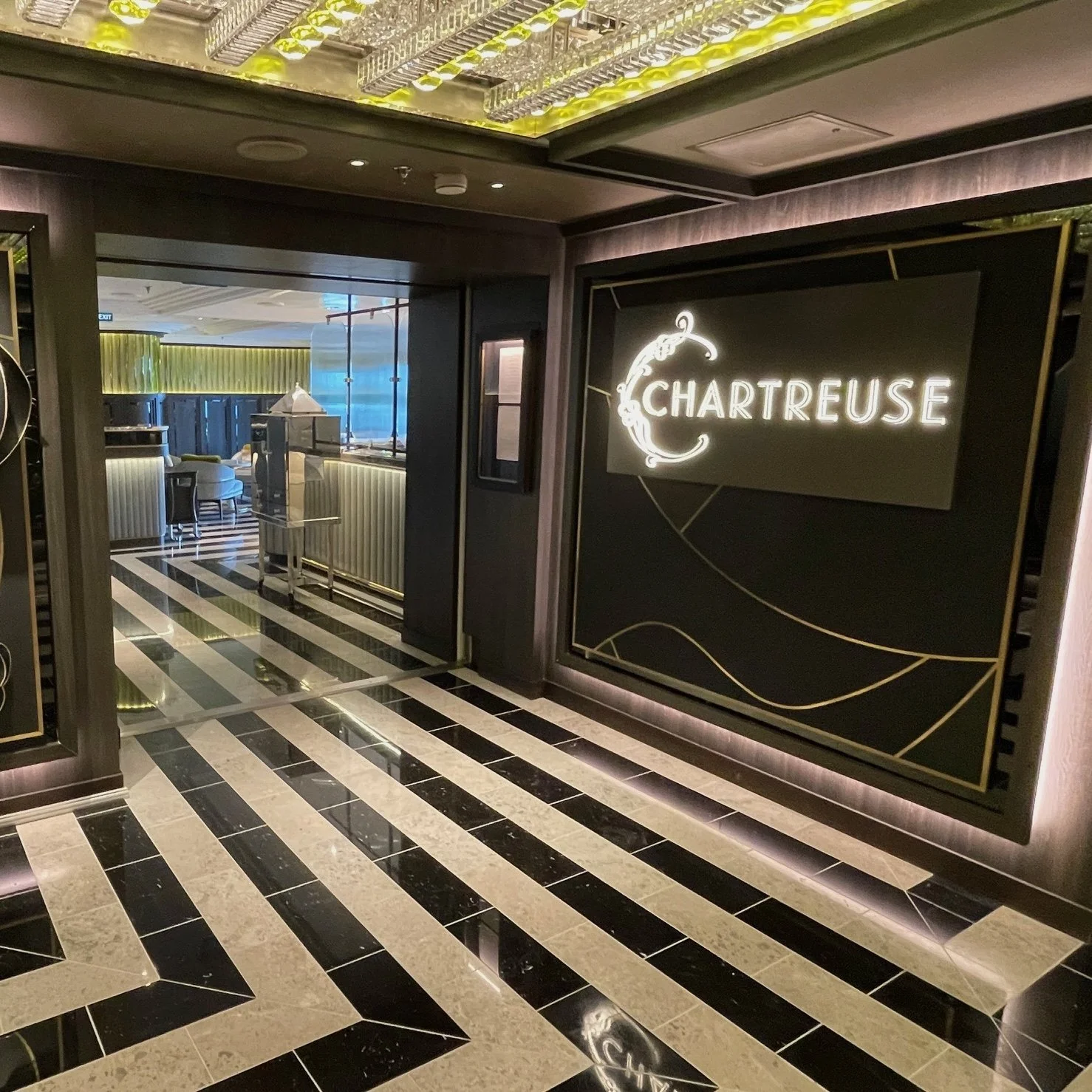 Our first meal on Grandeur, the buffet, showed us the high level of service from some of the 548 well-trained staff and the ship’s attention to detail. We were even more astonished as we headed for dinner at Compass Rose, the main dining room. With a simulated cascading waterfall at the entrance, the large, imaginative room resembled an enchanted forest of trees forming a canopy with dazzling jewels on their trunks. It was spectacular during the day but we were in awe as night approached and the sides of the room turned into an optical illusion of infinity.