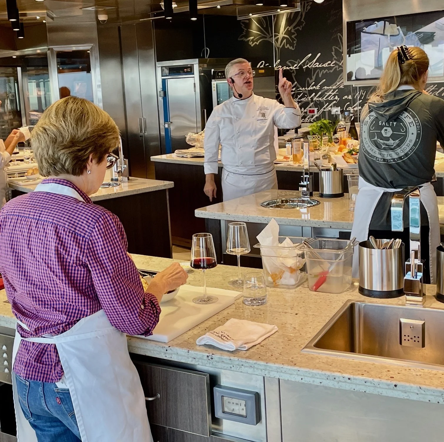 To our disappointment, the well-promoted guest celebrity chef, Christopher Gross, a James Beard Award winner, didn’t make an appearance until near the end of the cruise but it gave us a chance to sample Grandeur’s three specialty restaurants. But before trying them we passed the ship’s extensive library and headed to the bright and well-equipped Culinary Arts Kitchen on Deck 11 to meet its cheerful and knowledgeable Chief Instructor, Chef John Stephano of Philadelphia. His extra-cost classes ($US89) for 18 students are held each day, twice on sea days. “Because most of our guests are well traveled and sophisticated,” he told us, “my classes try to teach something new – a deep dive to the area, to the region.” He said he wants guests to understand the history of a cuisine. “If we can impart the richness and culture of the past, then guests have a better understanding of how the food affects their palate. Most people consume food. We want guests to taste it.” Chef Stephano had planned to take guests on a shopping and cooking expedition in Invergordon, Scotland, but the trip was cancelled when it was discovered that the preferred butcher shop was closed on Sundays.