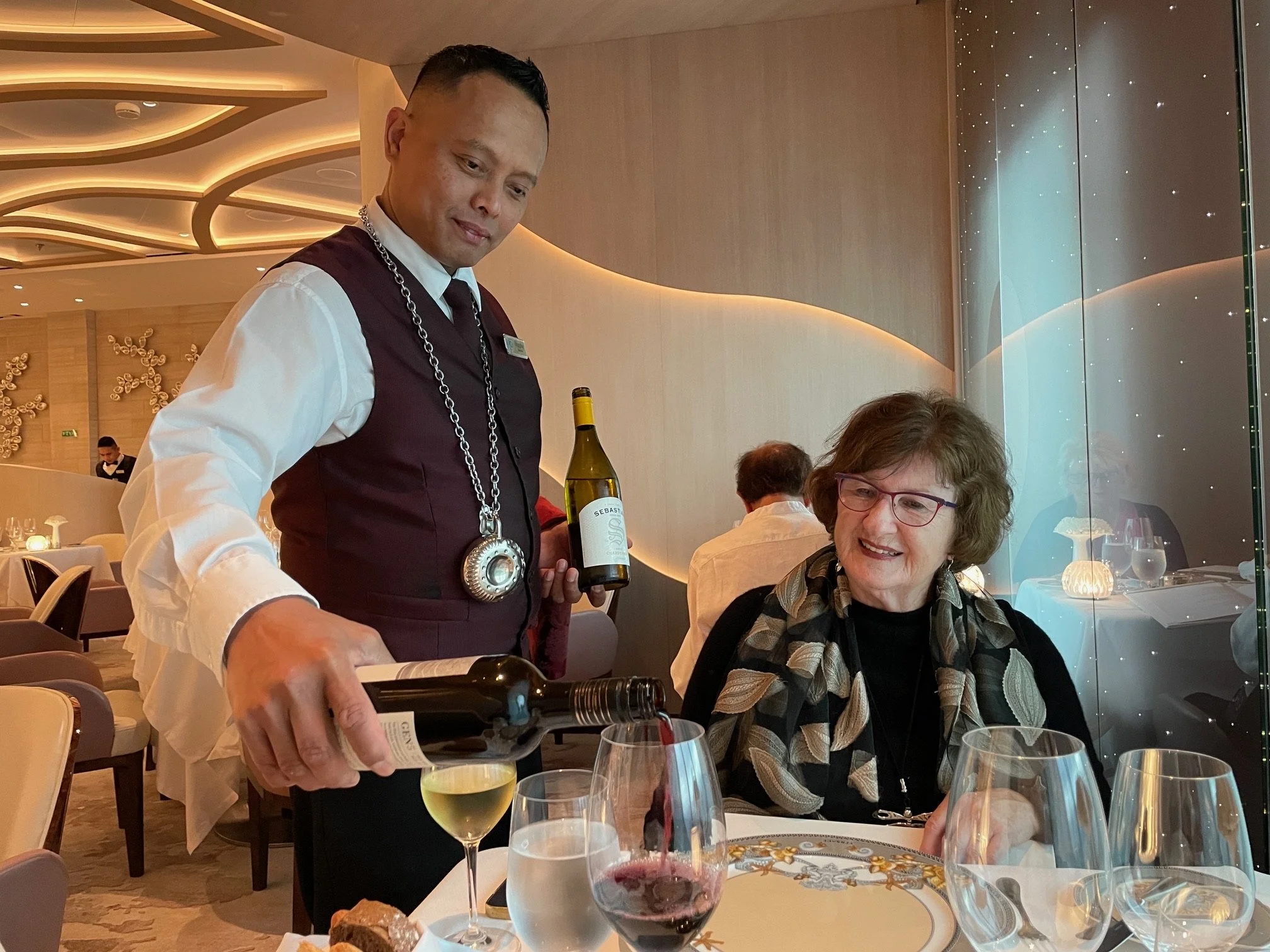 The menu in Compass Rose was the most complete we’ve ever seen on a cruise ship. In addition to a wide choice of daily specials on the right side, the left side of the large menu had an “Always Available” list of more than a dozen favorites ranging from Black Angus Filet Mignon to whole Dover Sole with many sauces and choices of side dishes. One guest told us he ordered Lobster Tail every evening for dinner. The Rossini style tenderloin with seared foie gras we ordered was the best piece of beef we’ve enjoyed on any cruise.