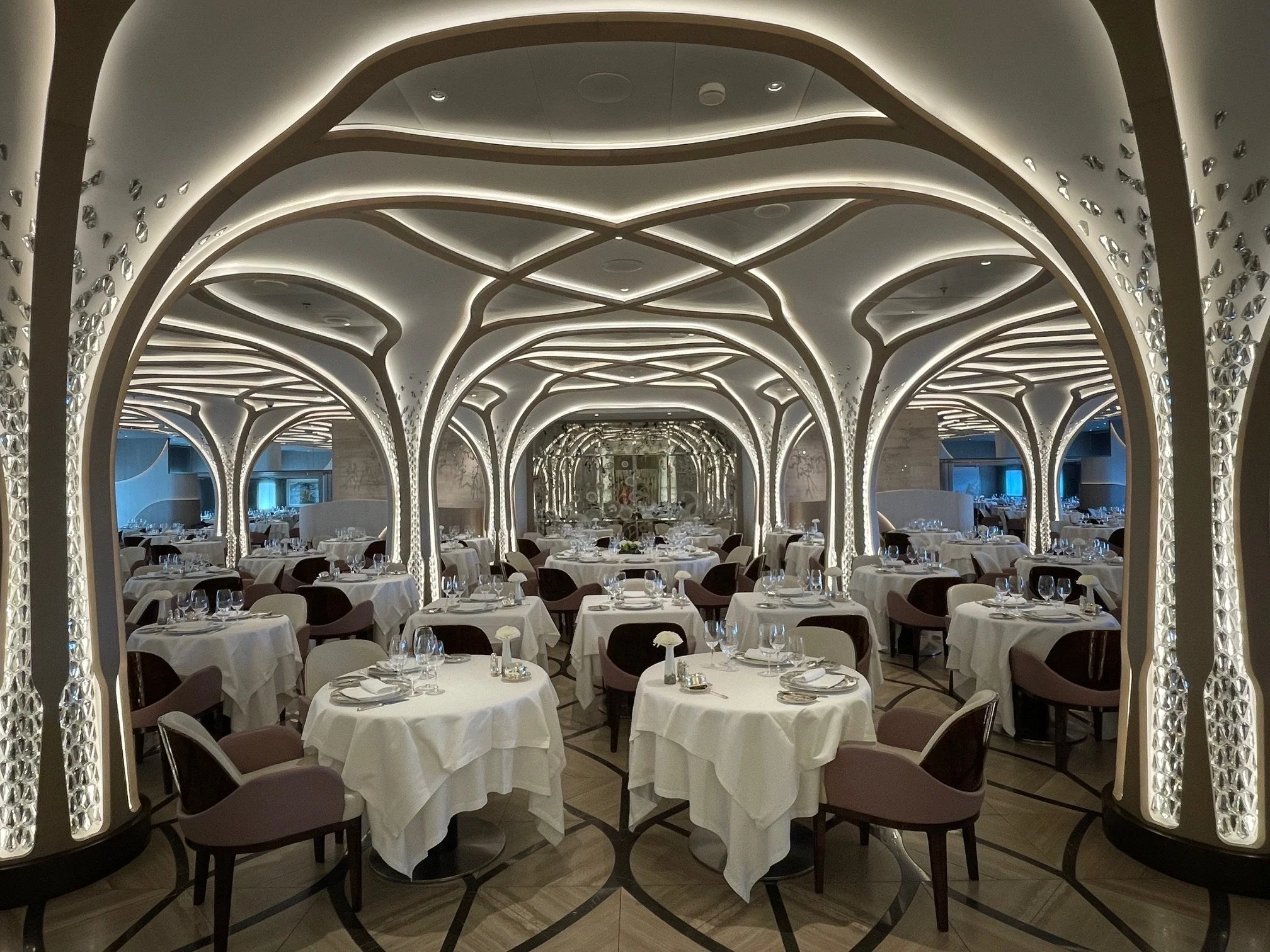 Next door to Manfredi’s on Deck 1 is The Chef’s Table, also only open for dinner. This is a unique ethnic Dégustation dining concept that features a set 4/5-course tasting menu which changes every 3 or four days. The meal includes a wine pairing with each course, however, an upgraded premium wine pairing is available for an additional $25 per person. If you have the Silver Spirits package, as we did on this cruise, the upgraded wine pairing is included.