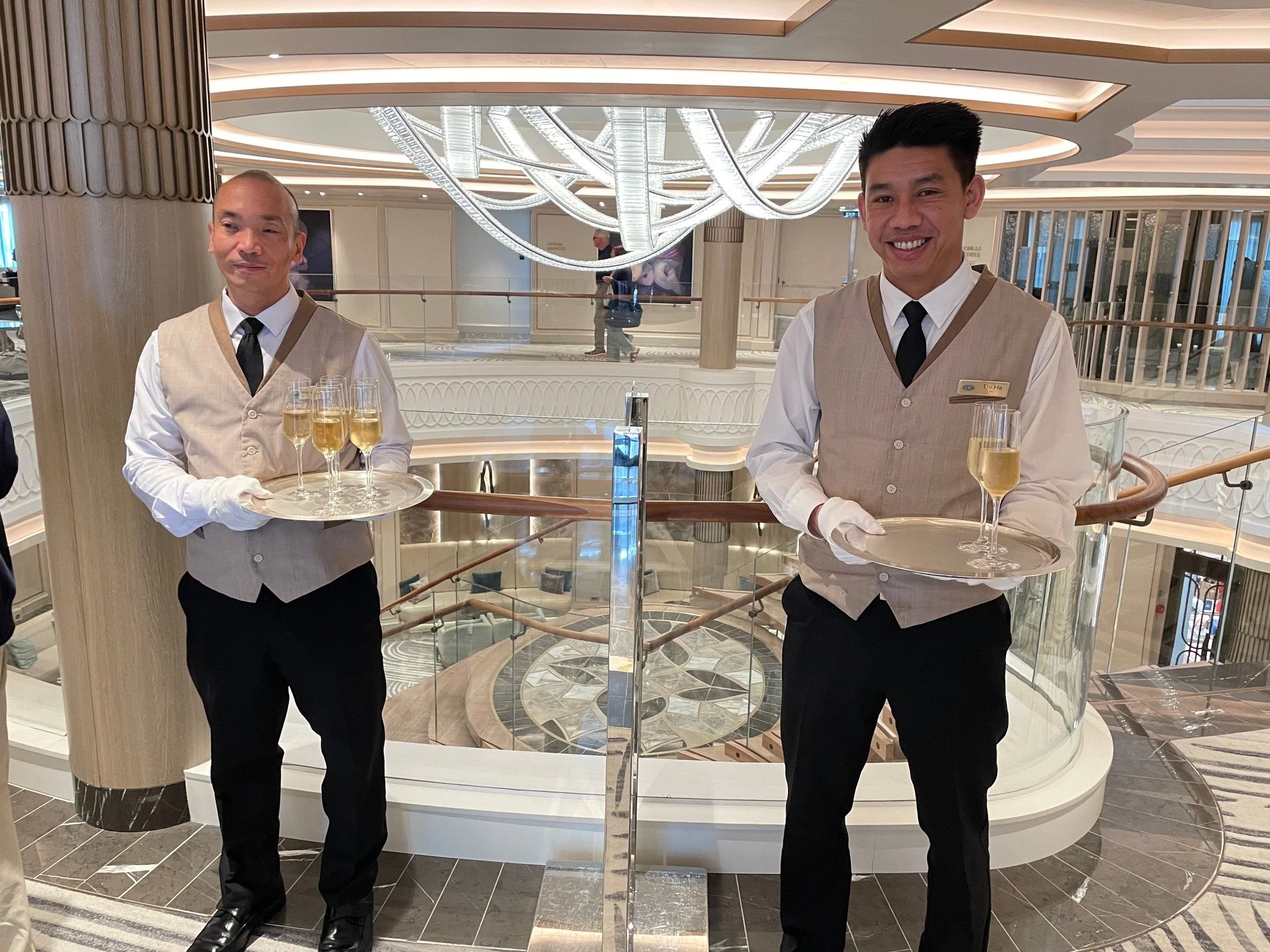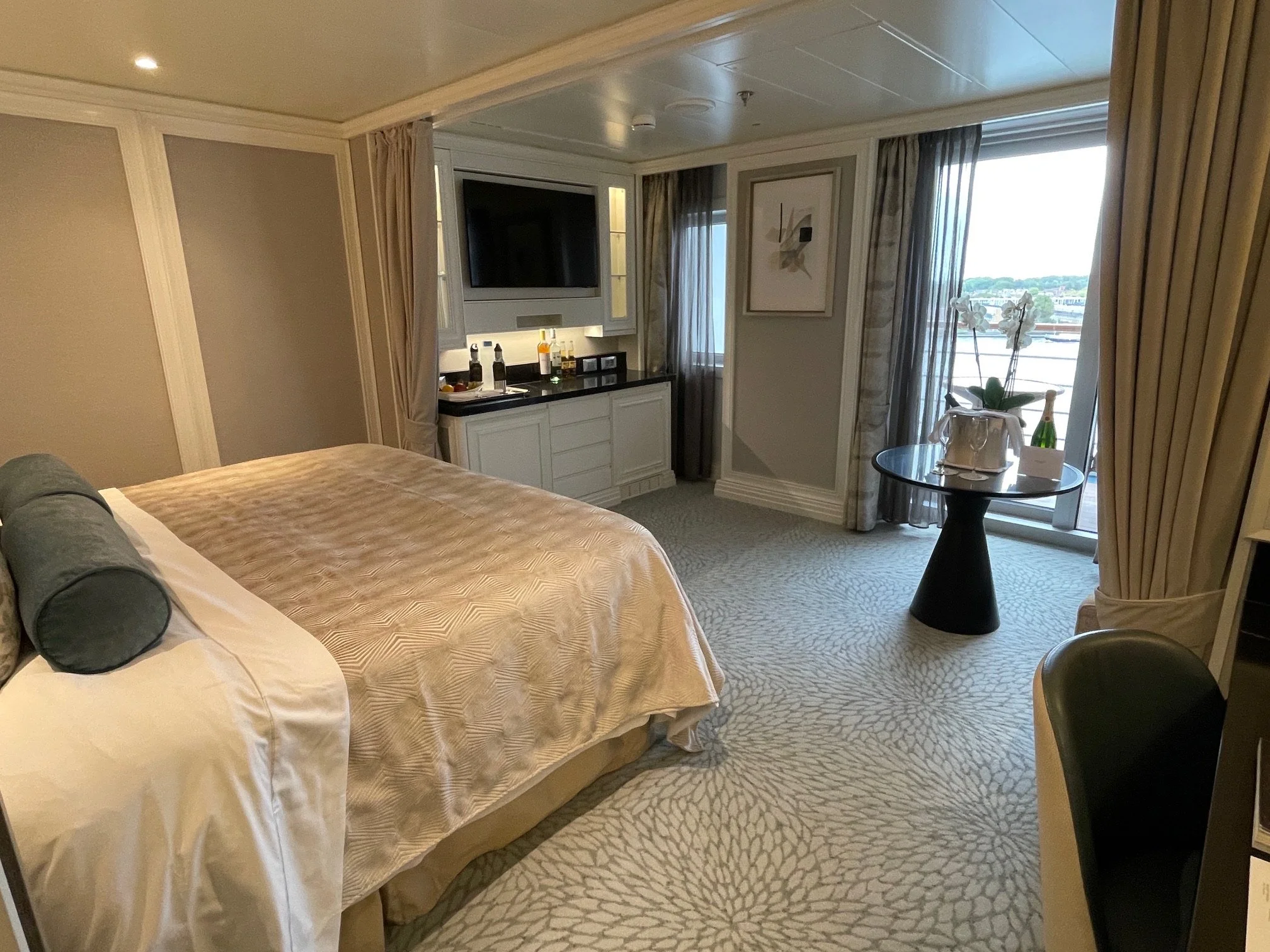 When we arrive at the Observation Lounge, we are greeted with welcome-aboard glasses of champagne, a luxury touch that you won’t find on many cruise lines. Check-in was as simple as showing our passport, getting a photo taken, and receiving our stateroom key cards. At check-in, we were informed that we had been upgraded to a suite on Deck 5 midship, most likely because the ship was only about 50% capacity. We were assigned to Suite 515.