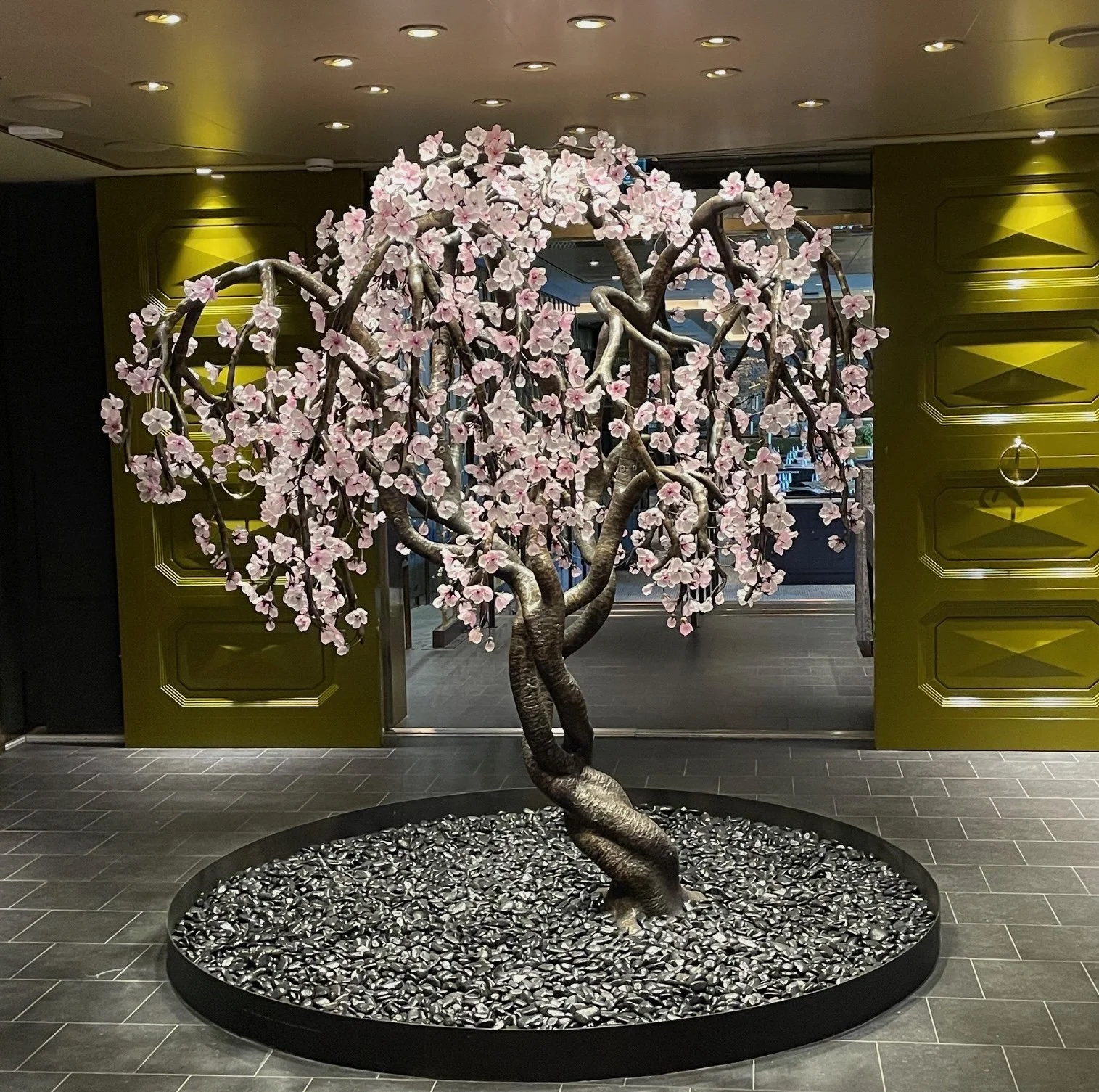 Taste was our objective over the next few days as we tried the three complimentary specialty restaurants. Appropriately, the entrance to the Deck 5 Pacific Rim Asian restaurant had a full size bronze Bonsai cherry tree with pink petals of Murano glass. We enjoyed several imaginative items from its extensive menu including Peking duck & watermelon salad, Canadian lobster tempura, pork and shrimp dim sum and flavorful miso black cod. Our optional chopsticks were put to good use. The other two specialty restaurants were close to each other on Deck 10. Typical of a good steakhouse, Prime 7 offered us large portions of high quality beef, pork, lamb and veal in addition to surf & turf or a whole lobster. Chartreuse evoked memories of a fine Parisian restaurant with appetizers of steak tartare & caviar and terrine de fois gras au sauternes topped with three rings (chef Gross later told us this was his favorite dish on the cruise). Entrée choices included fillet of halibut and seared Barbary duck breast. The complimentary wine was mostly from France.