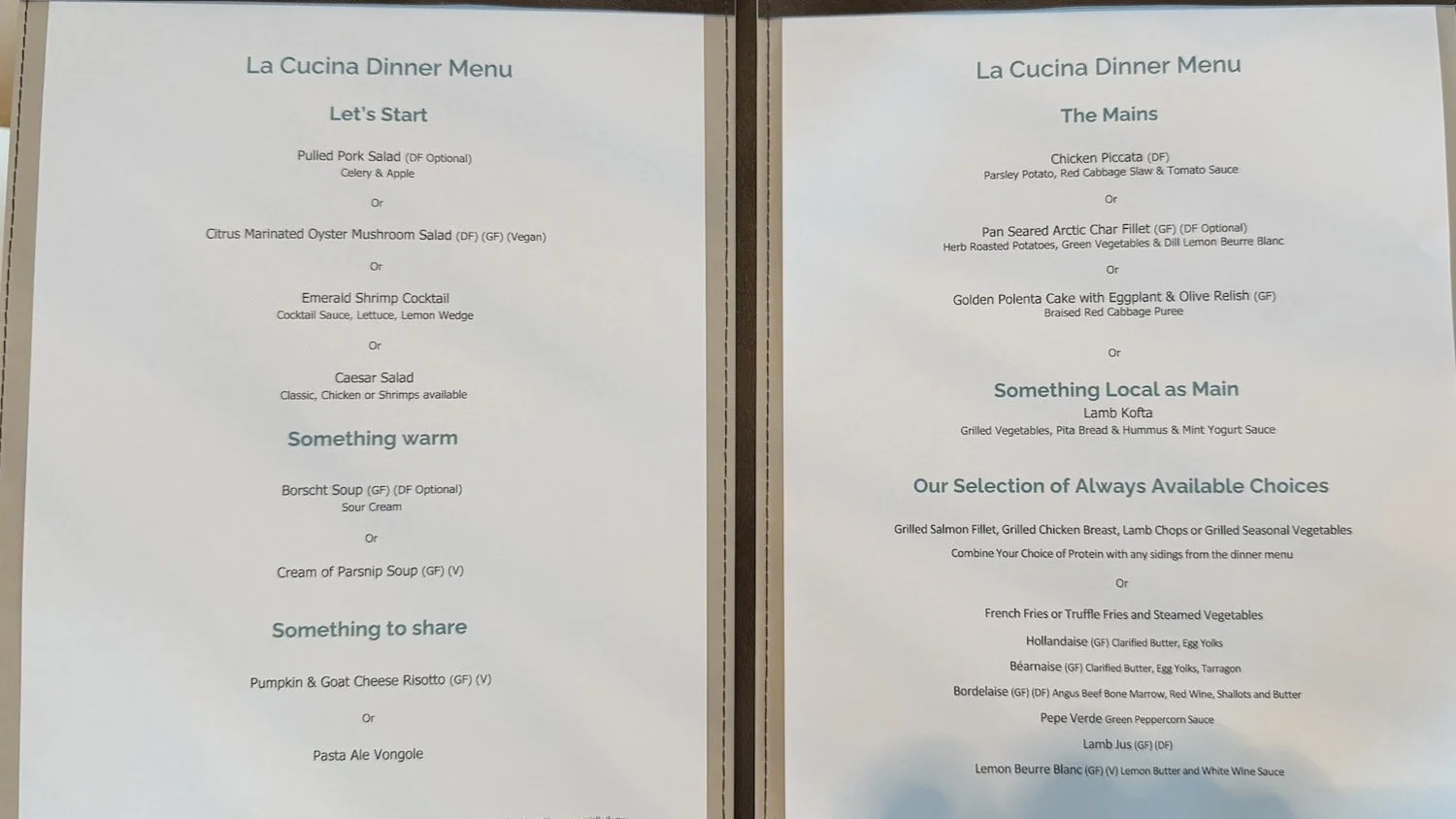 The Sky Bar closes from 7pm till 9pm so that guests can enjoy dinner during that time. There are no set dining times and guests are able to sit wherever and with whomever they wish. A few in our group decided to enjoy dinner in La Cucina on Deck 3. While this restaurant is a buffet at breakfast and lunch, in the evening it becomes a proper restaurant with full menu and table service. Menus change each evening.