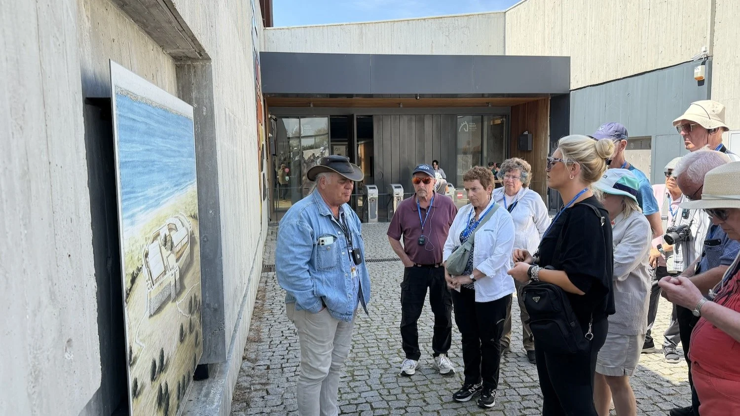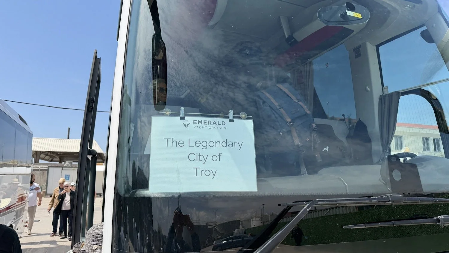 A motor coach is waiting next to the ship to transport guests to the Troy museum.