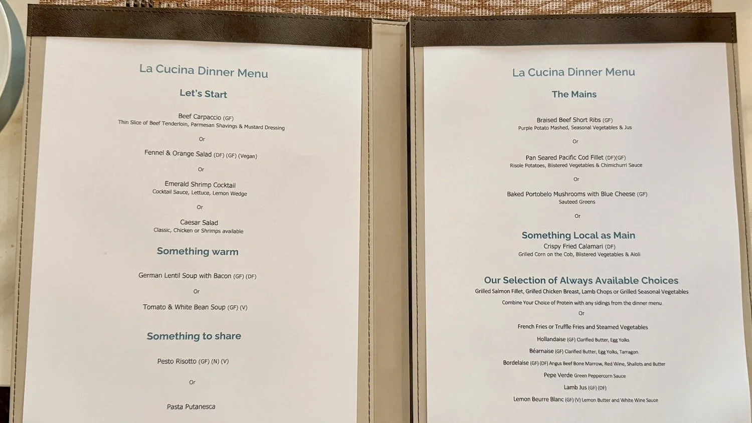 Our initial plan was to have dinner al fresco at Aqua Grill (Deck 6 aft) so that we could report on that experience. However, it is quite cold and windy this evening, so we decided perhaps we will try Aqua Grill at lunch one day while the ship is docked. That means a return to La Cucina for dinner this evening.
