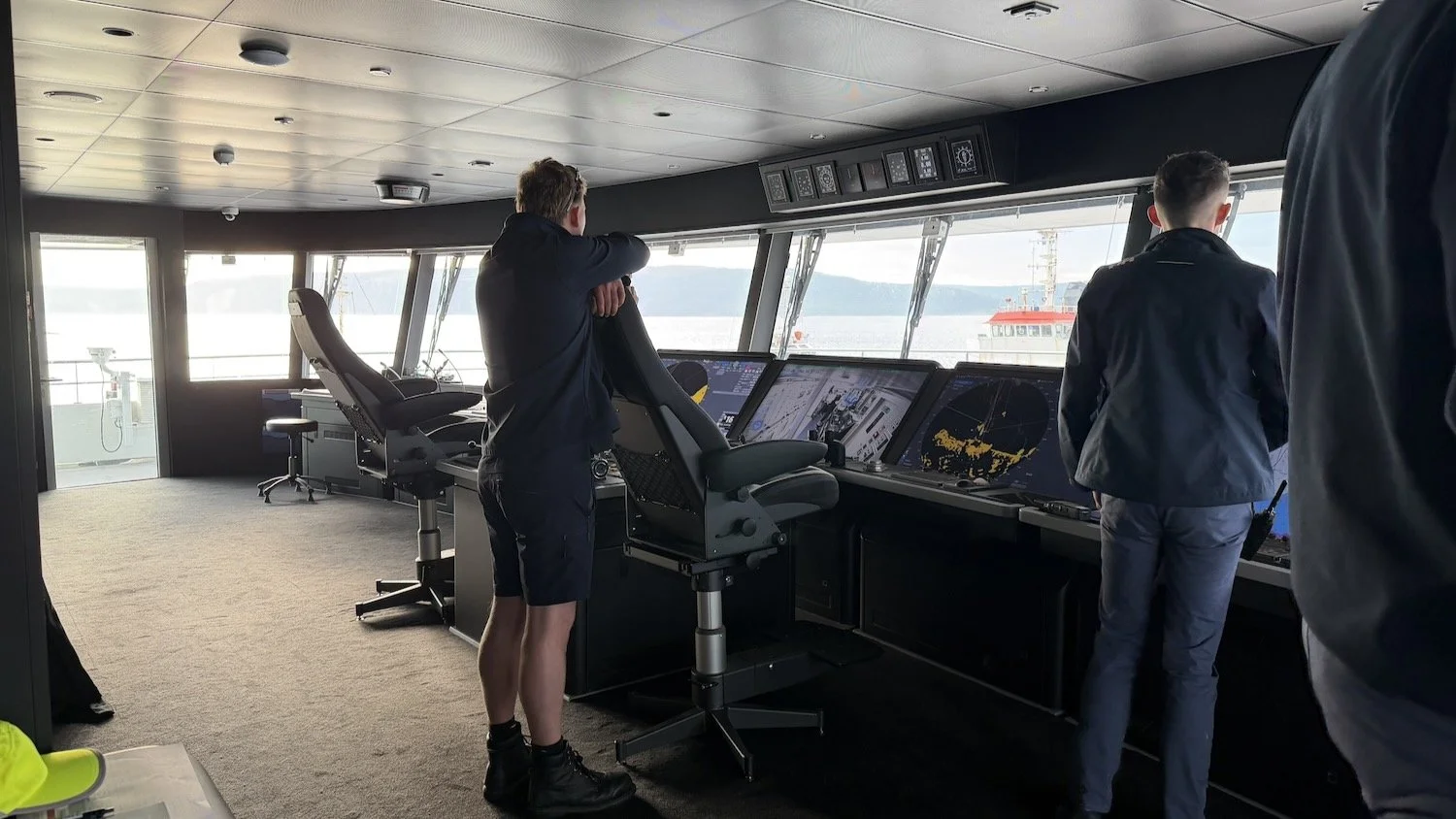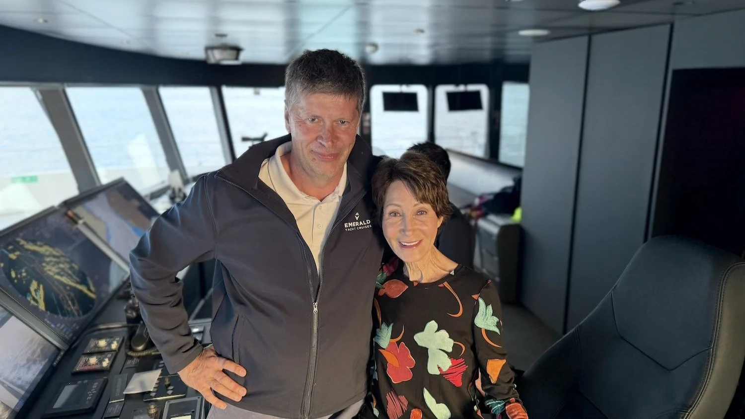 Rickee gets her photo taken with Captain Ratko Paravik on the Bridge.