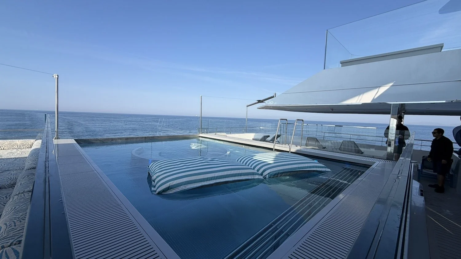 The Aqua Pool is an infinity-edge pool complete with two large floating pillows and a curved bench underwater where you can sit and enjoy the view.
