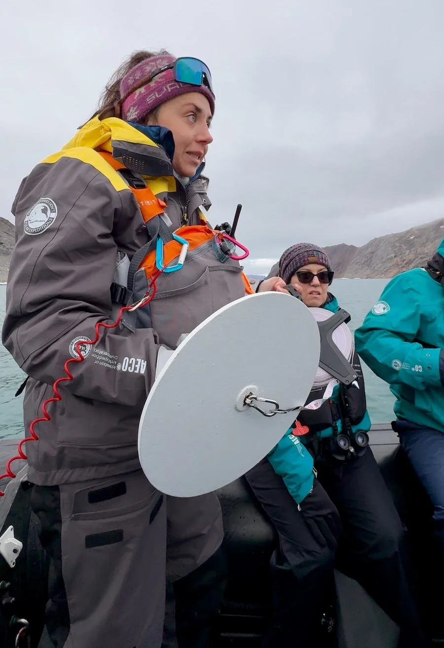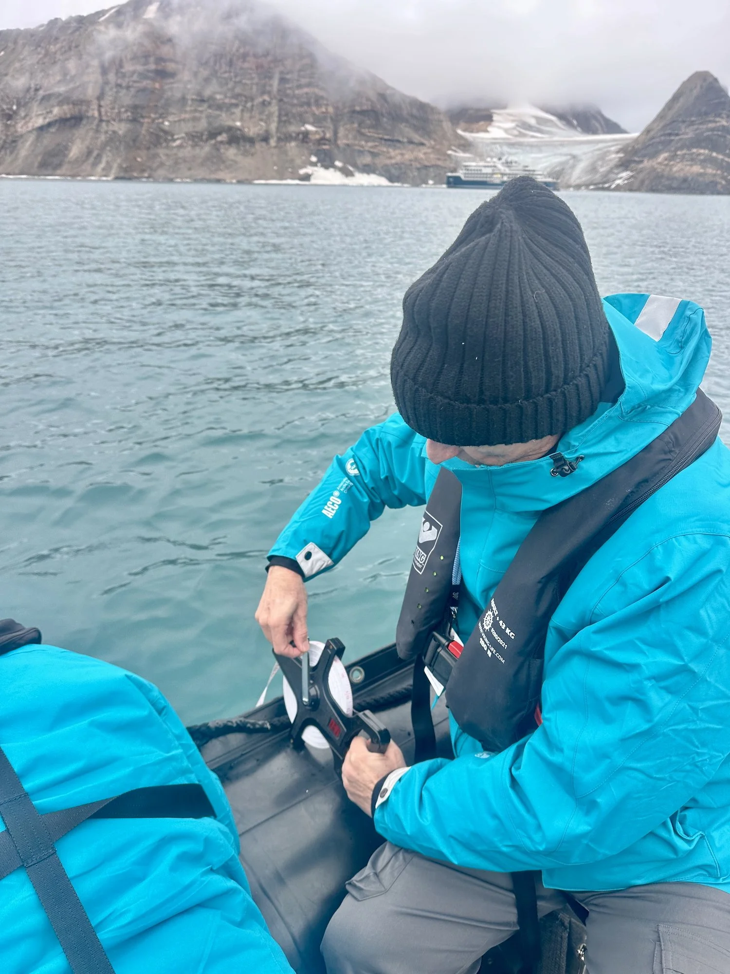 Toward the end of our tour, Anya deployed a disc designed to measure phytoplankton in this region. Very few, if any, ships ever visit this region. In fact, SH Vega may be the first. Part of SH Vega’s environmental mission is to collect scientific data from these remote regions and relay it to organizations that track these measurements. Anya asked for a volunteer to deploy the disc over the side of the Zodiac to measure how deep the disc could go underwater while still being visible from the surface. I was unreeling the measuring tape while other guests looked over the side to let me know when they could no longer see the disk. I think we made to about 10 feet, which seemed to please Anya.