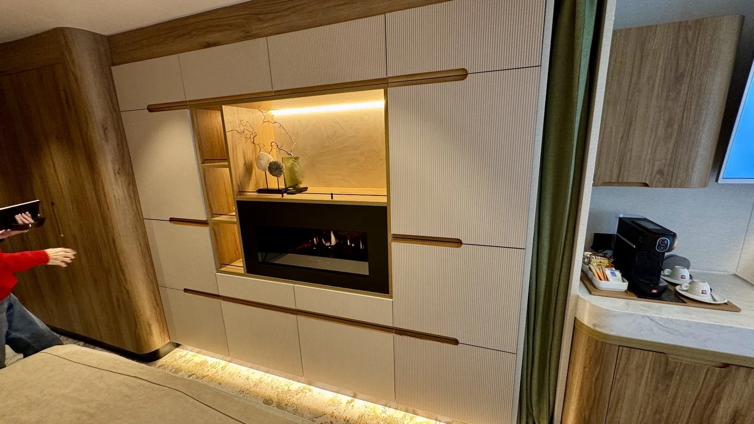 Later this morning, we were treated to a tour of some different stateroom categories on SH Vega. Below is a photo of the Standard Balcony stateroom, which would easily qualify as a suite on most ships. There is a literal wall of storage directly across from the bed and a simulated electric fireplace, complete with crackling fire sounds. To the left is a massive wardrobe closet. We will talk more about the stateroom categories in our upcoming video review on our YouTube channel, so make sure you are subscribed and have clicked the notification bell.