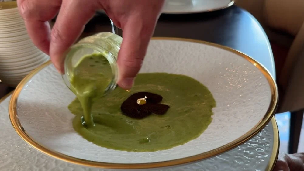 Presentation was second-to-none, like the pouring of the asparagus soup below. And, yes, that is 24-carat edible gold on top of the olive oil pearl in the middle!