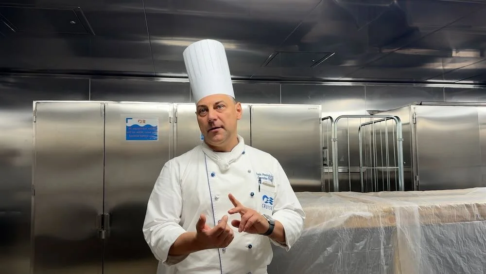 This evening we have dinner reservations at The Chef’s Table, the ultimate dining experience on Sun Princess. The Chef’s Table is limited to twelve guests and comes at a pricey $149 per person. We are greeted at Makoto at 5pm by Claudio, Director of Restaurant Operations. We were given glasses of champagne and soon we were being escorted to the galley. Each guest was given a white coat to wear into the galley and then we were introduced to Executive Chef Guido.