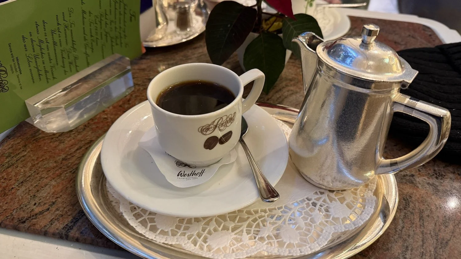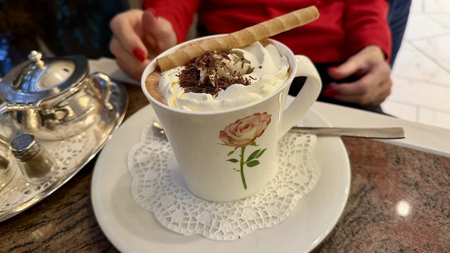 Rickee and I decided to seek refuge in a local cafe across from the cathedral. The cafe was huge and very busy. I ordered a cup of coffee and Rickee had hot chocolate. She claims it to be one of the best cups of hot chocolate she has ever had. Our total bill was 16.60€, or about $19 US. And, the merchant would not take a credit card for any ticket under 20€! Thankfully, I had enough Euro to cover the bill. I will need to find an ATM tomorrow to get more cash.