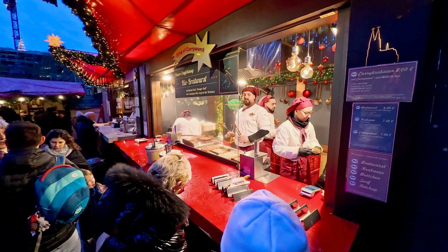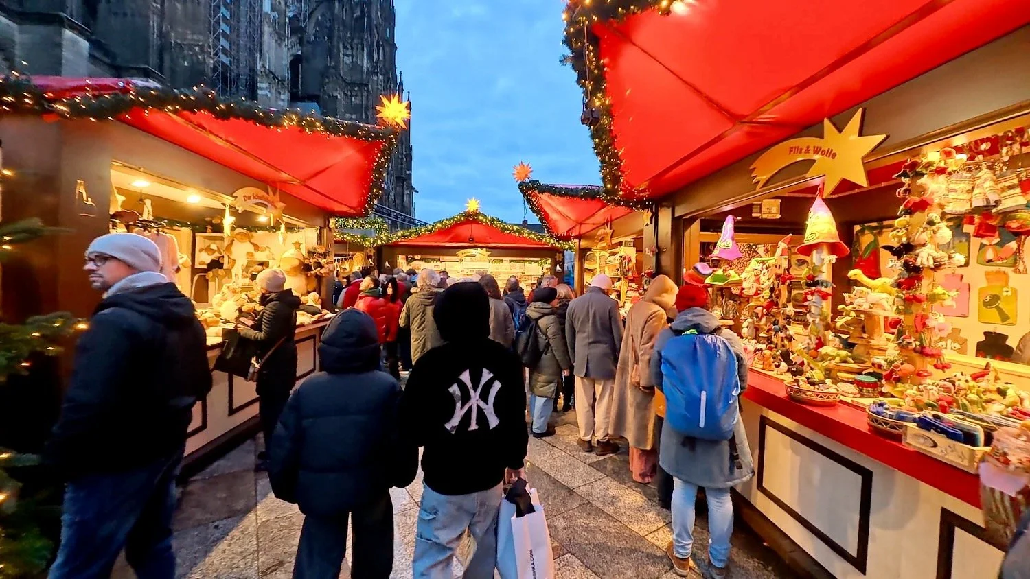 Our guide stops at one of the entrances to the main Christmas Market in Cologne (there are four of them) next to the cathedral. The elves depicted over this entrance to the market symbolize the spirit of Christmas giving and craftsmanship, with stalls featuring handmade goods and treats.