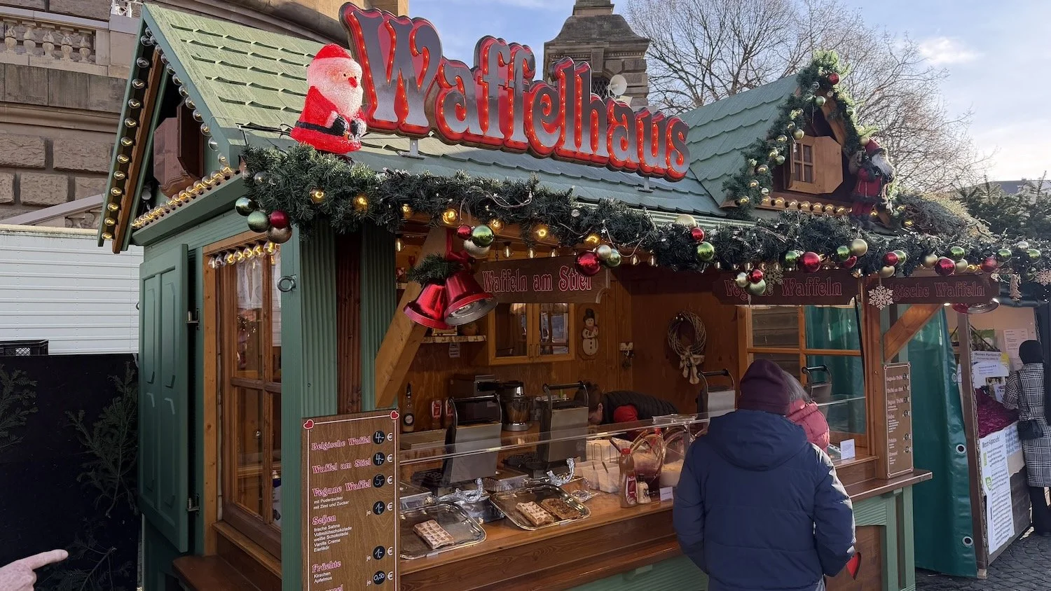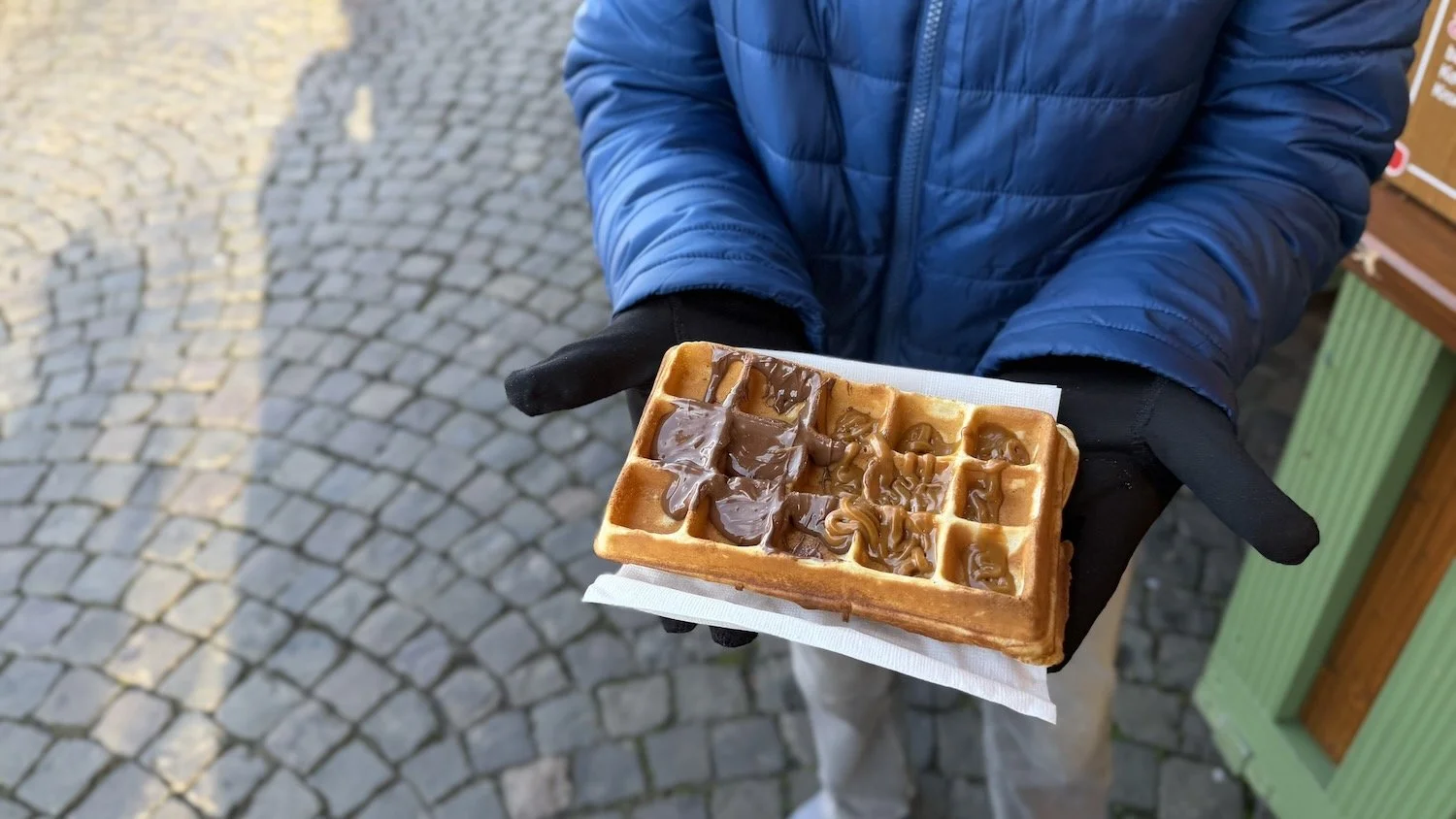 Our waffle was delicious. We had chocolate sauce on one half and a Biscoff sauce on the other. This was the beginning of our Christmas Market culinary journey.