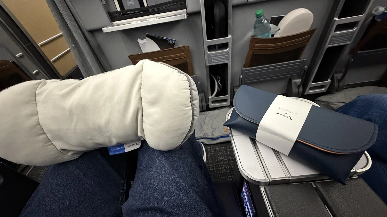 A large zipper bag was on each seat which contained a very comfortable neck pillow, blanket, headphones and an amenity kit. Included in the amenity kit are lip balm, hand lotion, a toothbrush w/toothpaste, socks, and earplugs.